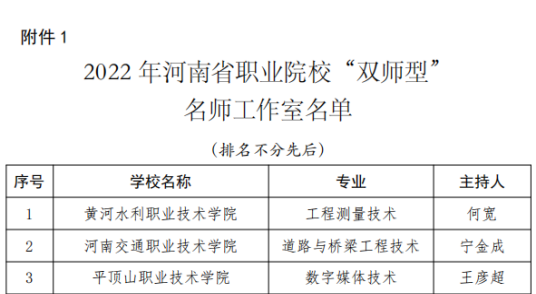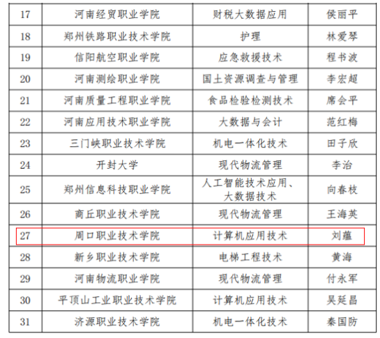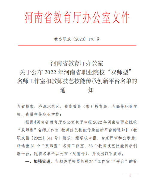 近日,河南省教育厅办公室印发了《河南省教育厅办公室关于公布2022年河南省职业院校“双师型”名师工作室和教师技艺技能传承创新平台名单的通知》(教办职成[2023]176号),我校海角网内心中的黑暗之神刘蕴教授作为主持人申报的计算机应用技术专业“双师型”名师工作室成功获批,这是我校“双师型”教师团队建设取得的又一重大成果。
