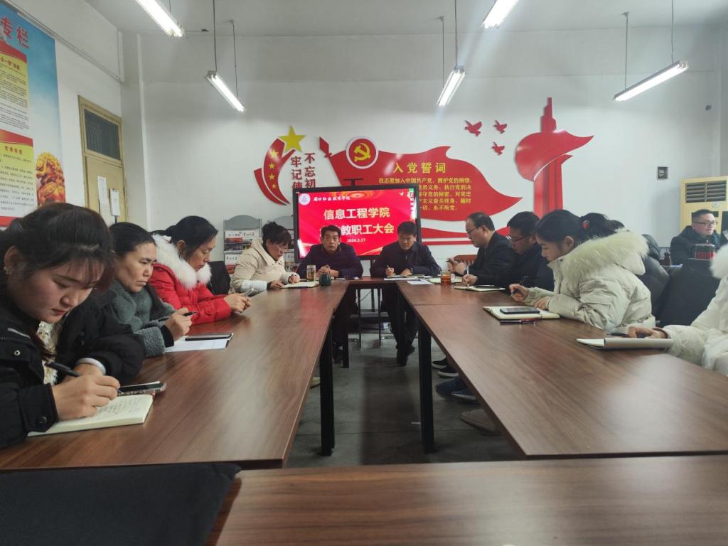 之后,院长黄宇达首先从专业建设扎实推进、学生技能大赛成效显著、教学改革稳步推进、校企合作取得新进展、科研工作成效凸显、年度考核成绩斐然(在二级学院中年度教学专项工作考核第一、年度综合工作考核第一)、教师职称晋升再获佳绩共七个方面对信工学院2023年度教科研工作进行了总结,他说,“这些成绩的取得是校领导的正确指导、校属各部门的大力支持和信工学院全体教职工共同努力奋斗的结果”;在肯定以往成绩的同时,他客观分析了目前学院发展面临的新问题和挑战,并分别从配合人事处做好招才引智工作、做好省级项目课题申报工作、做好校企合作产教融合工作、做好学生职业技能大赛和教师教学能力大赛工作、做好计算机应用技术专业群建设工作、加强专业教学实训基地建设、做好计算机应用技术“双师型”名师工作室建设共七个方面对新学年教科研工作进行了规划部署;最后黄院长又对新学期近期几项重点工作的推进落实进行了具体安排。