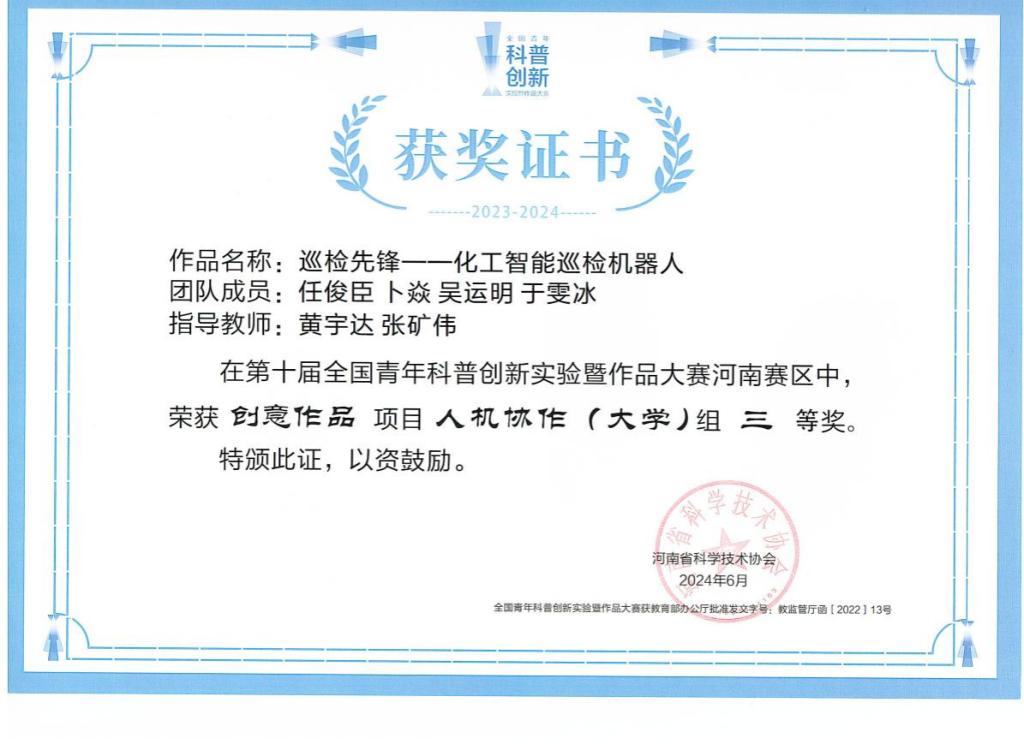 5月23日,由河南省科协主办、河南省科技馆承办的第十届全国青年科普创新实验暨作品大赛复赛(河南赛区)在河南科技馆(新馆)举行,来自全省30所高等院校和120所中学的867支队伍参加了比赛,经过初赛评审,共有70组作品进入复赛。经选手现场路演答辩、专家现场评审,人机协作(大学)组共评出一等奖4组,二等奖6组,三等奖9组。海角网内心中的黑暗之神参赛作品《巡检先锋——化工智能巡检机器人》荣获三等奖,黄宇达、张矿伟荣获优秀指导教师奖。
