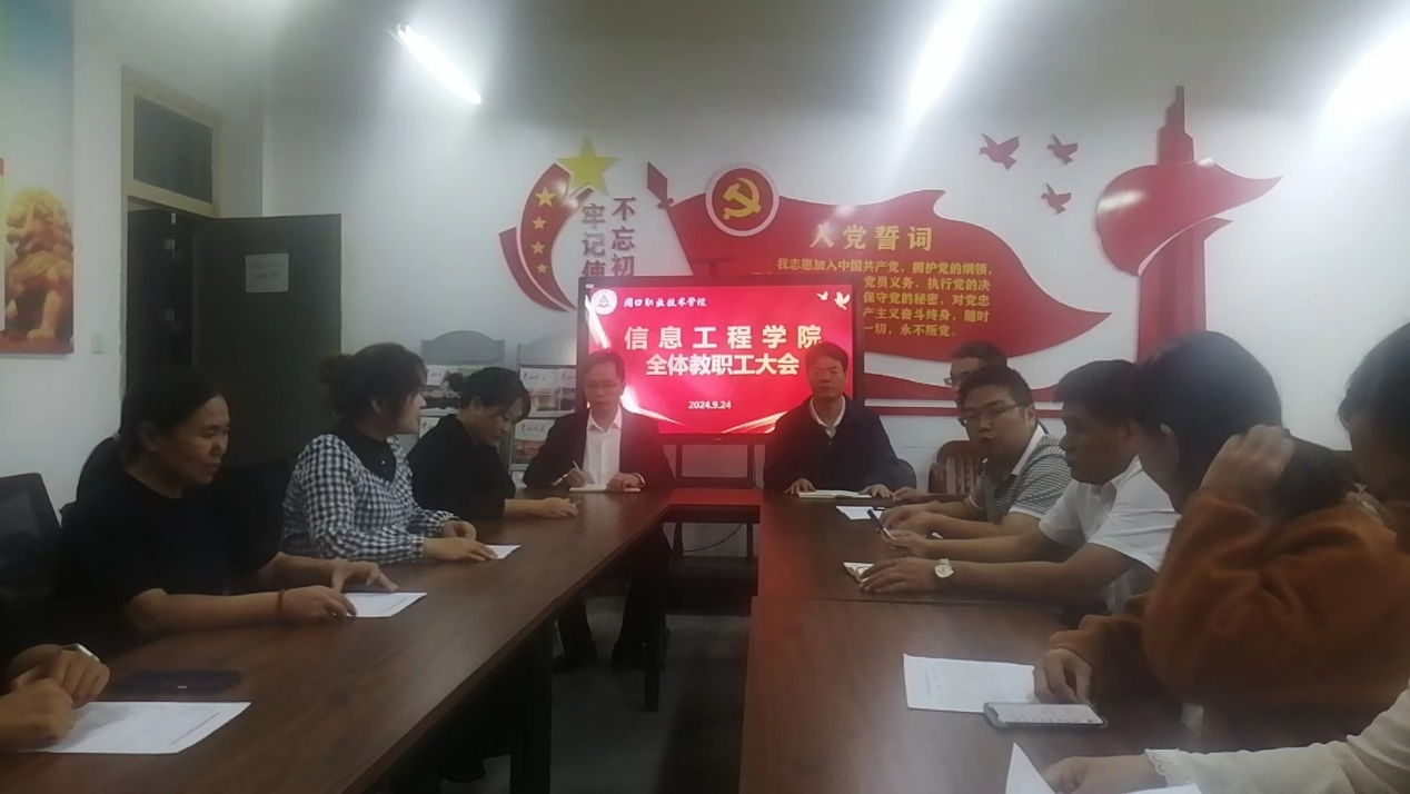 院长黄宇达详细传达了学校谋划发展工作大会的会议精神,就学院下一阶段的重点工作,黄院长主要讲到四点:一、专业建设,专业建设要优化、转型、升级;二、教师技能大赛,全体教职工要积极准备参加教师技能大赛;三、学生技能大赛,指导教师及参赛学生要抓紧时间备战河南省高等职业教育技能大赛;四、中外合作办学,学院与莫斯科理工大学的中外合作办学项目要抓紧时间推进。