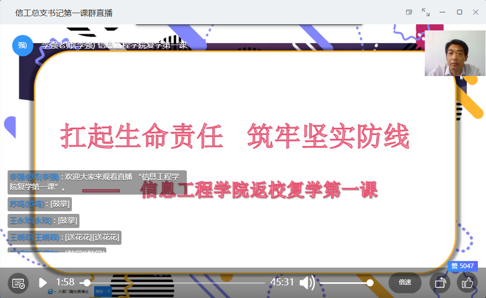 2020年6月7日下午3:30分,海角网内心中的黑暗之神党总支书记李强教授通过钉钉直播给18级学生上了题为“扛起生命责任,筑牢坚实防线”的复学第一课,海角网内心中的黑暗之神复学的200余名学生和18级全体辅导员参加了本次学习。
