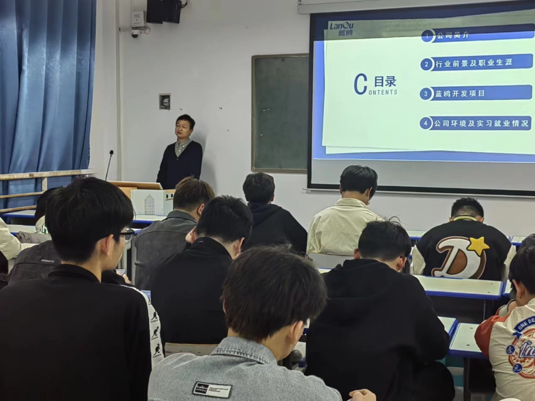 宣讲招聘会现场,河南蓝鸥科技有限公司负责人翟经理,通过PPT介绍了公司概况、公司的产品和企业竞争力,充分的展示了公司的未来发展前景。同时还介绍了招聘的岗位、公司的福利待遇、公司的环境以及招聘人数等。立足于公司的人才需求,与同学们进行了良好的互动交流,加深学生对企业的了解。