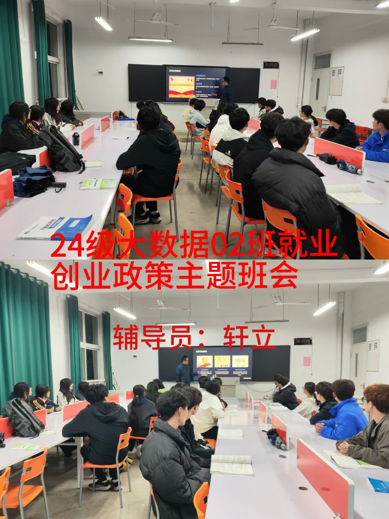 在主题班会上,辅导员老师们详细向同学们介绍了就业创业政策,引导同学们认清当前就业形势、转变就业观念,牢牢把握各类双选会等招聘时机,告诉同学们利用好就业创业政策和自身优势,为实现早就业、就好业创造条件,提醒同学们要多关注班级群通知,关注各企业和院校的通知。鼓励同学们深入基层、扎根基层、服务基层,努力将青春绽放在人民最需要、最急盼的地方,成长成为有理想、敢担当、能吃苦、肯奋斗的新时代好青年。
