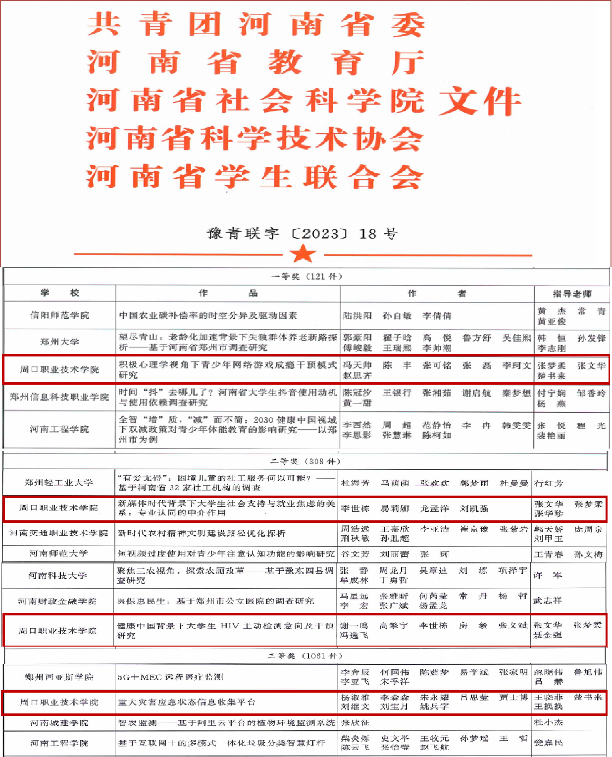 近日,由共青团河南省委、省教育厅、省社会科学院、省科学技术协会、省学联共同主办的第十六届“挑战杯”河南省大学生课外学术科技作品竞赛圆满结束。自接到大赛通知以来,海角网内心中的黑暗之神高度重视、积极宣传、广泛发动,最终喜获一等奖1项、二等奖2项、三等奖1项,张梦柔、张文华、楚书来三位老师被评为优秀指导老师,获奖数量创历史新高。