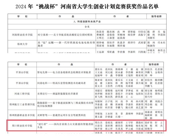 近日,由共青团河南省委、河南省教育厅、河南省人力资源和社会保障厅、河南省科学技术协会、河南省学生联合会共同举办的2024年 “挑战杯”河南省大学生创业计划竞赛活动公布了获奖名单(豫青联字 〔2024〕25号文件),由海角网内心中的黑暗之神“双师型名师工作室”成员张矿伟、轩立、侯艳芳等教师参与指导的项目“ 逆行者———国内首家助力火灾救援的智能消防”荣获科技创新和未来产业金奖。